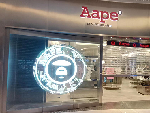 Aape是香港I.T集團(tuán)的知名日系街頭潮牌,智彩科技為廣州天環(huán)廣場(chǎng)Aape門(mén)店量身定制透明led顯示屏。